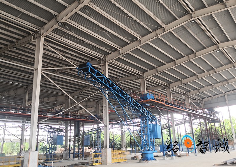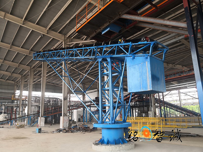 旋(xuán)轉式皮帶輸送機,為散(sàn)碎物料倉貯輸送設備,是在安裝有(yǒu)行走輪的支架上(shàng)部的底盤上安裝一轉盤,轉盤可相對底(dǐ)盤作旋轉運動,皮帶輸送機的進料端(duān)座在轉盤(pán)頂部的托盤上,出料端為懸臂式,配重箱在托盤上用以上與懸臂配重,倉貯時,物(wù)料通過(guò)料(liào)鬥由輸送(sòng)帶送至遠端,推動懸臂即可改變堆積位置,在庫房內實現多點堆積而勿需停機和移動機體,連續作業省時省力,操作方便,尤其適用於糧食的倉貯輸送。